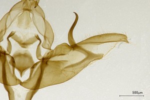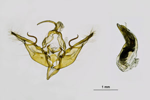 1-5: (1: Valvenkomplex), (2: rechte Valve), (3: Aedoeagus mit teilweise evertierter Vesica), ♂, Frankreich, Mezel, 12 km S Digne-les-Bains, La Celestine, 43°59' N, 6°12' E, 560 m, 5. Oktober 2012, am Licht (leg., präp., det. & fot.: Hartmuth Strutzberg)