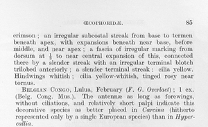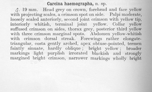 Meyrick (1937: 84-85) schreibt zu seiner neuen Art: "The antennae as long as forewings, wihout ciliations, and relatively short palpi indicate this decorative species as better placed in Carcina (hitherto represented only by a single European species) than in Hypercallia." Barcoding-Daten zur Absicherung dieser Zuordnung liegen nicht vor.
