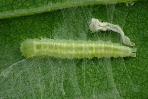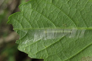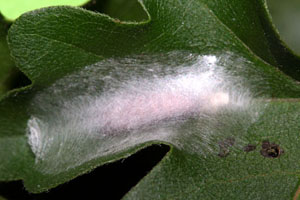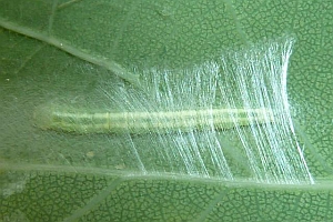 Schütze (1931) schreibt zusammenfassend: "Polyphag an Laubholz, besonders Quercus, Fagus. An der Mittelrippe der Blattunterseite in einem glasig farblosen Gespinst (Rössler)."