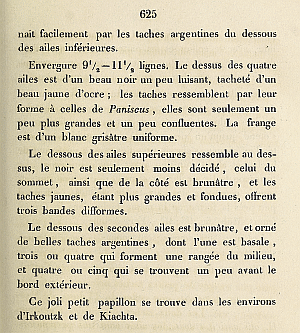 - Erstbeschreibung: Eversmann (1851): Description de quelques nouvelles espèces de Lépidoptères de la Russie. — Bulletin de la Société impériale des naturalistes de Moscou 24 (2): 610-644. Moscou (W. Gautier).