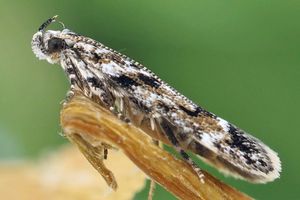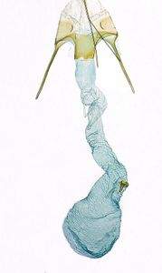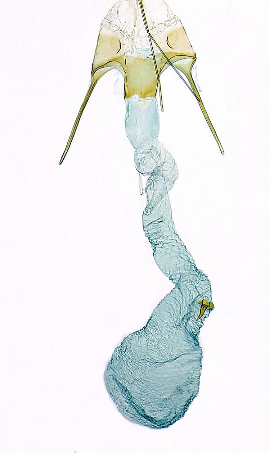 1: ♂, Österreich, Niederösterreich, Strelzhof, leg. Raupen in Blattgespinsten von Großer Sternmiere (Stellaria holostea) 2. Mai 2009, verpuppt ca. Mitte Mai, e.p. 12. Juni 2009 (leg., cult, det., Präparation & Mikrofoto: Peter Buchner)