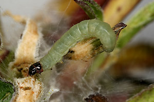 Diese „andere Silene“ stellte sich als Silene nutans heraus, denn Schütze (1931: 88-89) konnte von eigenen Beobachtungen von C. leucomellanella berichten: „Die grüne Raupe ist ohne weiteres an dem dunkelroten ersten Segment zu erkennen. Wahrscheinlich miniert sie in erster Jugend, frisst sich dann zwischen die obersten Blättchen eines Seitentriebes ein, welche nach und nach welken und beim Suchen als Leitmerkmal dienen. Sie verzehrt aber nur den heurigen Wuchs, verlässt die Wohnung, sobald sie auf vorjähriges Holz stößt und bohrt sich gewöhnlich unten zwischen den kleinen Blättchen in den Stängel, höhlt ihn aber nicht aus, sondern begnügt sich mit Rinde und Bast. Der Kot hängt in verhältnismäßig großen Klumpen zusammengesponnen am Bohrloch, ist grün, wenn die Raupe die Rinde von innen benagt, hellgrün vom Bast und fast gelb, sobald sie Holz angreift. Oft schützt sie sich bei Wohnungswechseln durch etwas Gespinst. Sie lebt an Silene nutans und geht zur Verpuppung auf die Erde (Schütze).“