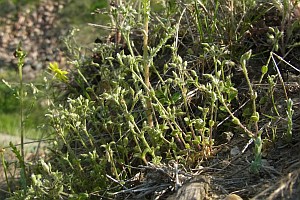 3-4: Befallsbilder (zusammengesponnene Blütenstände) an Sand-Hornkraut (Cerastium semidecandrum): Deutschland, Sachsen, Noitzscher Heide bei Lindenhayn, Kiesgrube, 30. April 2011 (det. & Freilandfotos: Heidrun Melzer)