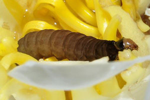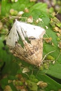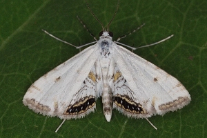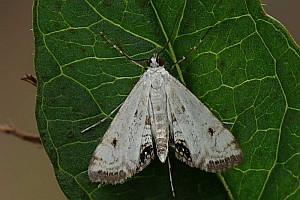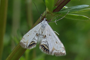 "Dies ist ... eine Pyralide aus der Gruppe der "Wasserschmetterlinge". Die Raupen entwickeln sich an und unter der Oberfläche von Stehgewässern. Aus Wasserlinsen bauen sie sich ein Häuschen (ähnlich Köcherfliegen), das sie mit Luft anfüllen und dauernd mit sich herumschleppen. Sie ernähren sich auch von Wasserlinsen. Das abgebildete Tier ist ein Weibchen." (Autor: [Rudolf Bryner])