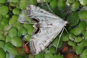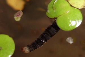 Nach Goater et al. (2005) lebt die Raupe vor allem an Wasser- und Teichlinsen der Gattungen Lemna und Spirodela; im Grunde ist sie aber ziemlich polyphag und kann in der Zucht selbst mit ins Wasser gelegten Robinien-Blättern (Robinia pseudoacacia gefüttert werden. Bei ihrer Auflistung ist nicht sicher, ob es sich stets um Freilandbeobachtungen handelt (offensichtliche Fütterungspflanzen werden hier weggelassen), etliche Angaben stammen aus Gartenteichen: