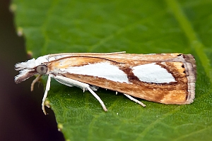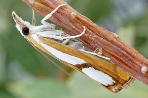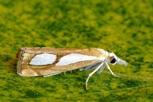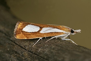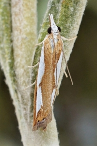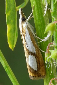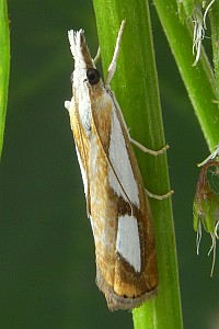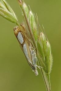 Catoptria pinella ist aber kleiner und intensiver gefärbt: Grundfarbe kräftig goldbraun, die weissen Striemenflecke stärker kontrastierend als bei Catoptria conchella. Catoptria pinella bewohnt vorzugsweise trockenwarme Biotope. Catoptria conchella ist eine boreo-alpine Art auf Wiesen in montaner bis alpiner Höhenlage. (Rudolf Bryner)