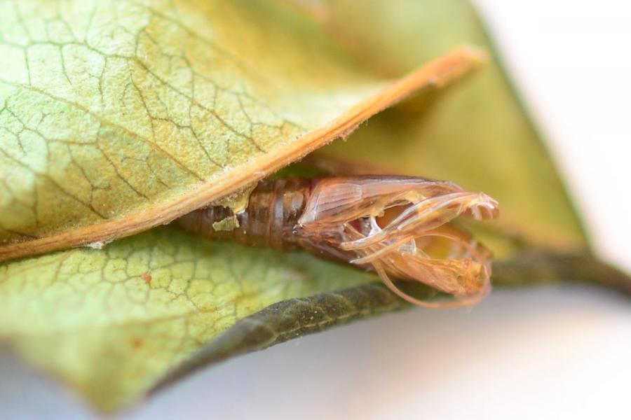 1: Exuvie, Deutschland, Hamburg-Rissen, Schnaakenmoor, Wanderweg zwischen Moor und Mischwald, Raupe 28. April 2020 an Prunus padus (Gewöhnliche Traubenkirsche), Zuchtfoto 10. Mai 2020 (cult., det. & fot.: Klaus-Uwe Gnaß), conf. nach Falterschlupf Hans-Peter DeuringForum