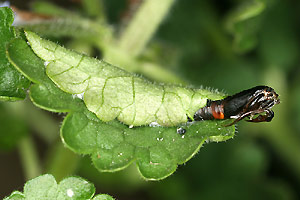 Hancock et al. (2015: 55) stellen die Daten aus Großbritannien zusammen: "Ovum [...] Laid in batches of two or threee in June - August on the upper surface of a leaf of a wide range of herbaceous plants, shrubs and trees, including Ononis, Mentha, Caltha, Ranunculus, Inula, Cirsium, Chrysanthemum, Lysimachia, Chenopodium, Urtica, Artemisia, Filipendula, Fragaria, Sanguisorba, Epilobium, Rubus, Salix, Betula, Ligustrum and many others, even including Larix (Styles, 1959), Picea (Winter, 1974) and Pteridium (Lawton, 1978)".