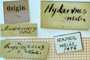 1-3: Syntypus ♀ von Thymele hydarnes Mabille, 1877, Daten siehe Etiketten (fot.: Ernst Brockmann, Fotos bearbeitet: Michel Kettner), coll. Zoologisches Museum der Humboldt-Universität zu Berlin.