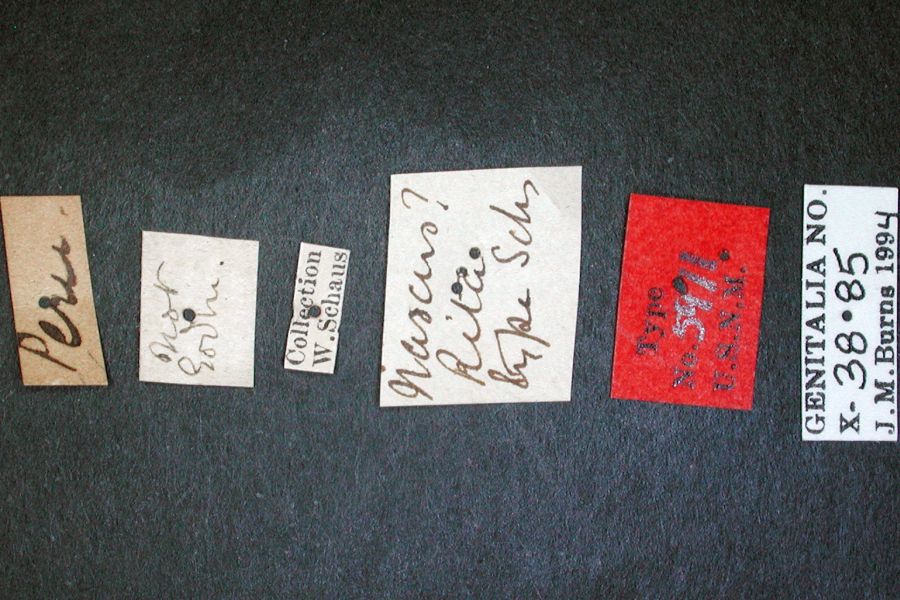 7-9: Lectotypus ♀ von Nascus orita Schaus, 1902, Daten siehe Etiketten (fot.: Bernard Hermier, Fotos bearbeitet: Michel Kettner), coll. National Museum of Natural History, Washington, D.C., USA.