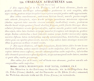 • Erstbeschreibung: Felder & Felder & A. F. Rogenhofer (1864-1867): Reise der österreichischen Fregatte Novara um die Erde in den Jahren 1857, 1858, 1859 unter den Befehlen des Commodore B. von Wüllerstorf-Urbair. Zoologischer Theil. Zweiter Band. Zweite Abtheilung: Lepidoptera. Atlas: 1-10 (Inhalts-Verzeichniss pl. I-LXXIV), 1-10 (Erklärung der Tafeln LXXV-CVII), 1-20 (Inhalts-Verzeichniss Tafeln CVIII-CXL), pl. I-CXL.