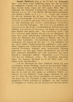 - Beschreibung als Gnophos dubitaria var. graecaria: Staudinger, O. (1892): Neue Arten und Varietäten von paläarktischen Geometriden aus meiner Sammlung. — Deutsche entomologische Zeitschrift Iris 5 (1): 141-260, pl. II.