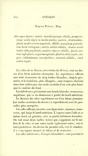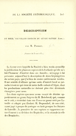 - Erstbeschreibung: Pierret (1837): Description de deux nouvelles espèces du genre Satyre (Latr.). — Annales de la Société Entomologique de France 6: 303-307 + pl. 12 fig. 6. Paris (F. G. Levrault).