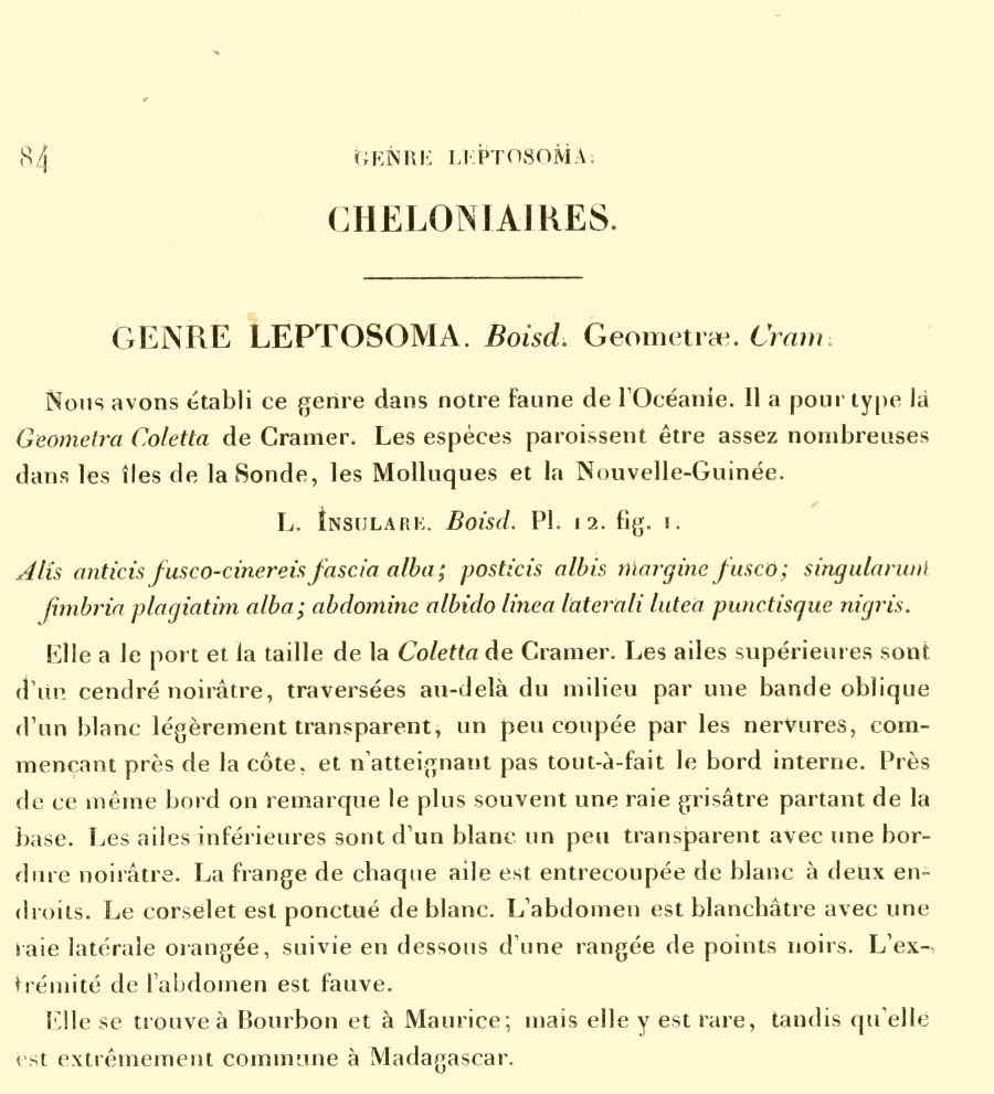 - Leptosoma insulare Boisduval, 1833 [Originalkombination]