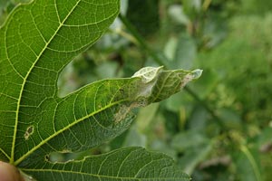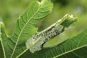 M. Ochse [M. Ochse, Lepiforumsbeitrag 29. September 2013] teilt mit: "Der an Feigen lebende Choreutis nemorana (Feigen-Spreizflügelfalter) breitet sich in der Pfalz weiter aus. Deutliche Fraßbilder und Raupen wurden von mir am 22.9.2013 in Weisenheim am Berg (Foto) und am 29.9.2013 in Dirmstein (beides Landkreis Bad Dürkheim) festgestellt. Sicherlich ist die Art am Haardtrand bereits heute weit verbreitet." E. Blum [E. Blum, Lepiforumsbeitrag 2. Oktober 2013] ergänzt dazu: "ich habe den Eindruck, die Art breitet sich entlang der Weinstraße rasant aus. Fundpunkte bislang: Neustadt(Stadtmitte), Haardt, Gimmeldingen, Deidesheim (Feigengasse) und Forst."