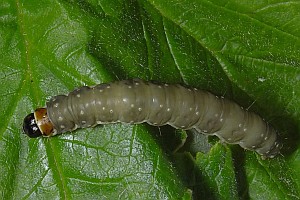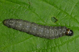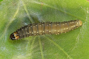 Kennel (1910: 134-135) fasste zusammen: "Die Raupe ist dunkelgrau oder olivgrün, die Wärzchen sind weiß, der Kopf ist schwarz, das Nackenschild braun, seitlich und hinten schwarz gerandet, die Analklappe gelbbraun. Sie lebt im April und Mai bis in den Juni in Blattrollen von Quercus, Sorbus, Prunus cerasus, avium, Sambucus, Ulmus, Pyrus, Corylus, Vaccinium myrtillus und verpuppt sich in der Wohnung."