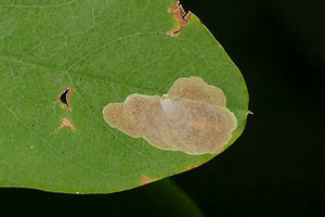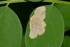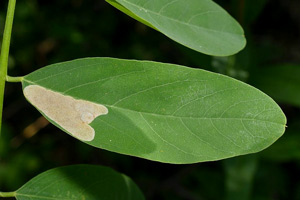 Huemer & Mayr (2022: 1238) fassen den Kenntnisstand zusammen: "The larval ecology in Europe is unknown but probably corresponds to observations published from elsewhere. In North America larvae produce large, yellowish blotch mines of irregular shape on Robinia species (Fig. 5), including R. hispida L., R. neomexicana A.Gray, R. pseudoacacia L., and R. viscosa Michx. ex Vent. (De Prins and De Prins 2006–2018). Pupation is reported inside and outside the leaf-mine (Braun 1908)." Damit werden also alle 4 beschriebenen Robinia-Arten genutzt. In der Erstbeschreibung wurde die Art von Fitch (1859: 838) bei den Arten mit Minen in Blättern von Robinia pseudoacacia besprochen, also der Pflanzen-Art, die sich seit ihrer Verschleppung nach Europa massiv breit gemacht hat. Sie ist auch nin Nordamerika die weitaus wichtigste Pflanze für diesen Falter, denn [Moths of North Carolina (abgefragt 14. November 2022)] vermerken: "The primary host is Black Locust (Robinia pseudoacacia), but other Robinia are occasionally used, including Bristly Locust (R. hispida) and Dwarf Locust (R. nana). As of 2022, all of our host records are for Black Locust except for two records for Dwarf Locust in the Sandhills and one record for Bristly Locust from xeric habitats in Burke Co." Auch in China wurde massiver Raupenbefall aussschließlich an Robinia pseudoacacia festgestellt (Liu et al. (2015)).