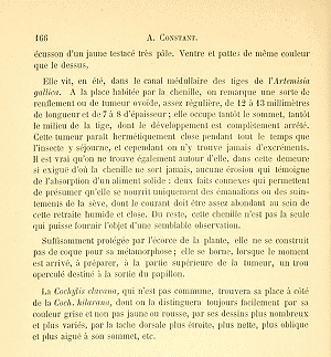 Gemäß Erstbeschreibung von Christoph (1872) lebt die Raupe ausschließlich an (bzw. in) Artemisia gallica; diese Pflanze fehlt aber zumindest in einem Teil des Vorkommensgebiets.