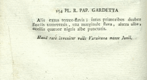 - Erstbeschreibung: De Prunner, L. (1798): Lepidoptera pedemontana. I-LII, 1-124. Augusta Taurinorum (Mathaeus Guaita). — Digitalisat der Bayerischen Staatsbibliothek München: [74].