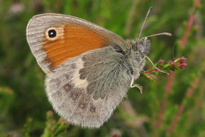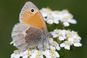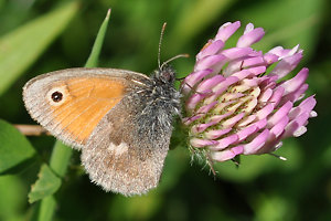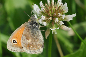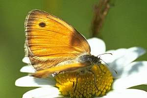 Verwechslungen mit drei Arten der Tribus Maniolini, Pyronia tithonus, Maniola jurtina und Hyponephele lycaon, sind normalerweise wegen der viel kleineren Flügelspannweite von C. pamphilus nicht möglich; im Zweifelsfall hilft wieder ein Blick auf die Hinterflügel-Unterseite: Die Maniolini haben dort entweder überhaupt keine Augenzeichnung oder zwei weit auseinander liegende Punkte, niemals jedoch die für C. pamphilus typische, bogenformige Reihe aus ca. 6 angedeuteten Flecken. Während sich die Maniolini gelegentlich mit ausgebreiteten Flügeln sonnen, zeigt C. pamphilus ohne Fremdeinwirkung nur in seltensten Ausnahmen (wie oben auf Falterbild 4) die Flügel-Oberseite. (Jürgen Rodeland)