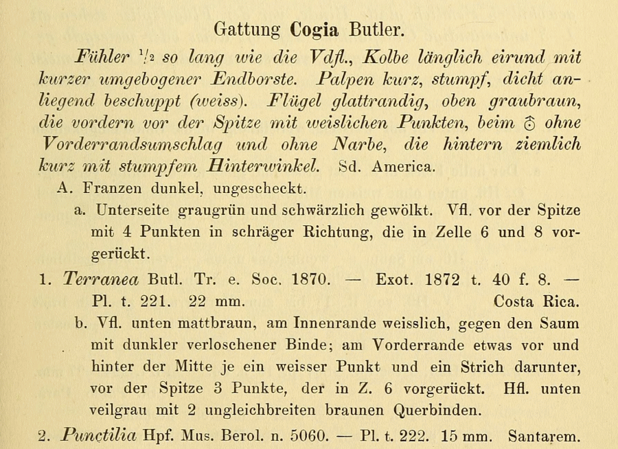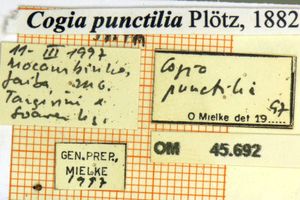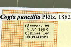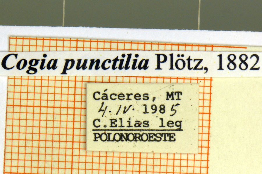 Plötz beschrieb nach einem Exemplar aus Santarem in der Sammlung des Zoologisches Museum der Humboldt-Universität zu Berlin „Punctilia Hpf. Mus. Berol. n. 5060.“ In der Berliner Sammlung findet sich unter diesem Namen ein einzelnes Männchen einsortiert, welches als Type etikettiert ist, von O. Mielke genitalisiert und von diesem als Holotype erkannt wurde, siehe Mielke (2005): “Cogia punctilia Plötz, 1882 (Hopffer in litt.). Berl. ent. Ztschr. 26: 259; n° 5.060, Santarém, [Pará, Brazil] [Bahia (Brazil) - on the label of the type]”.