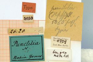 Mielke ist aufgefallen, dass der Fundort des Belegexemplares nicht Santarem ist, sondern laut Etikett Bahia. Eine weitere Abweichung wurde allerdings von ihm übersehen, die Nummer, welche Plötz für seine Type angab, ist 5060 (wie auch Mielke anführt), das Belegexemplar trägt aber auf dem gedruckten Etikett die Nummer 5059. Plötz vergab die Nummern an Einzelexemplare, dadurch sind diese als Holotypen eindeutig identifizierbar. Der Beleg in Berlin hat ferner ein handgeschriebenes Etikett mit folgendem Text: „punctilia (Hpffr) Pl. 5060 [## unleserlich] type“, womöglich eine Zuordnung dieses Falters zur von Plötz beschriebenen Art.