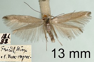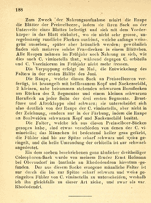 - Hinweis: Die Bestimmung des Falters in der Sammlung des NHMW lautete Coleophora idaeella, dies wurde nach dem Genitalpräparat auch von Andreas Stübner bestätigt. Daneben und eindeutig diesem zugeordnet, steckte auf einer unetikettierten Nadel ein Sack. Dieser stammt aber nicht von Preiselbeere, kann daher nicht der Sack der C. idaeella sein. Denn diese lebt nur an Preiselbeere (nach Auskunft von A. Stübner, so auch in SCHÜTZE). Die Angabe auf dem Etikett scheint "Vacc. oxycocc" zu lauten, jedenfalls nicht "Vacc. vitis-idaea", hier dürfte also auch etwas nicht stimmen. Fazit: es bleibt ein sicher determinierter Beleg übrig und die Erkenntnis, dass es auch in gut betreuten Sammlungen Fehler und Fallen gibt (Einfügung von Peter Buchner nach Telefonat mit Andreas Stübner am 14. November 2009)