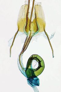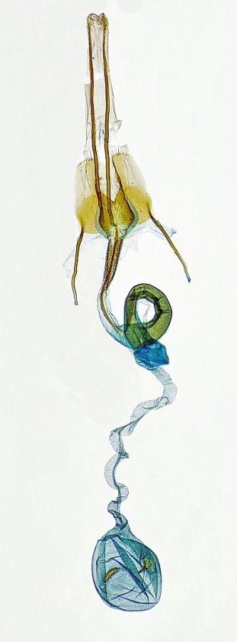 1: Präparat eines nicht abgebildeten ♂, Österreich, Niederösterreich, Perchtoldsdorf, am Licht 28. August 2016 (leg., Präparation, det. & Mikrofoto Peter Buchner (Einschub-Bild: Phallus-Apodem im nicht eingebetteten Zustand)