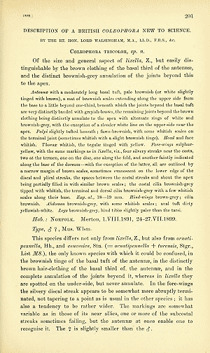 - Erstbeschreibung: (1899): Walsingham, [T.] (1899): Description of a Coleophora new to science. — The Entomologist's Monthly Magazine, Second Series 10 (= 35): 201-202. London (Gurney & Jackson).