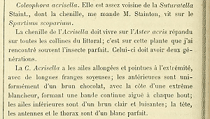Millière (1872) betont: "La chenille de l'Acrisella doit vivre sur l'Aster acris répandu sur toutes les collins du littoral; c'est sur cette plante que j'ai rencentré souvant l'insect parfait." Offensichtlich war es also die erwartete Nahrungspflanze, A. acris, die für den Namen acrisella verantwortlich war. Die Pflanze ist jetzt unter dem Namen Galatella sedifolia in Florenwerken zu finden - Nahrungspflanze von C. acrisella ist sie dennoch nicht (es sei denn, die Falter machen hier Blütenbesuch).