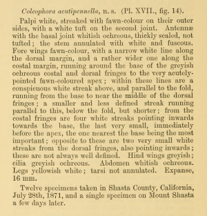 - Erstbeschreibung: Walsingham (1882): North American Coleophorae. — The Transactions of the Entomological Society of London for the Year 1882 (3): 429-442, pl. XVII.