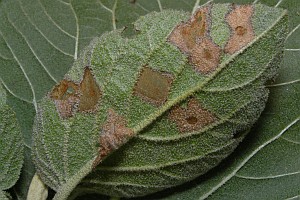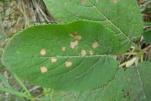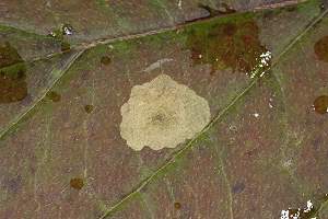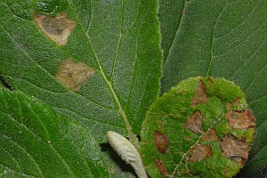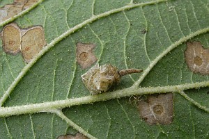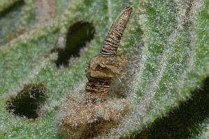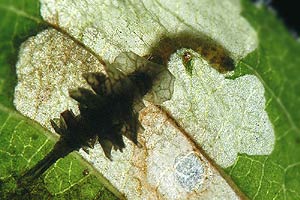 Im Herbst frassen die Raupen noch fleissig und produzierten grosse Minen in den Blättern des Kreuzdorns (siehe Befallsbild 1). Zur Überwinterung stellte ich die Zuchtbehälter nach draussen und holte sie Ende März in Zimmertemperatur. Die Raupen frassen jetzt nicht mehr. Drei Wochen später schlüpften die Falter. [Rudolf Bryner]