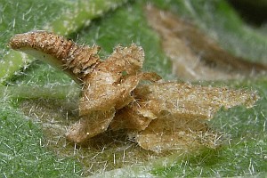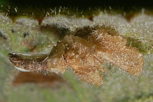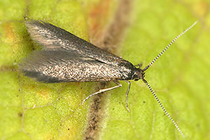 Patzak (1974: 243) schränkt endlich ein: "Raupe im Sommer und Herbst in einem Lappensack an den Blättern verschiedener Laubhölzer minierend. Manche Angaben über die Futterpflanzen dürften wegen der großen Ähnlichkeit der Säcke auf einer Verwechslung mit hornigi und potentillae beruhen. Sicher sind Rhamnus, Viburnum, Symphoricarpus und Lonicera." Dies passt gut zu den Angaben von Emmet et al. (1996: 239-240) aus England: "Ovum. Laid on a leaf of buckthorn (Rhamnus catharticus), alder buckthorn (Frangula alnus), wayfaring-tree (Viburnum lantana) or dogwood (Cornus sanguinea). Continental authors add alder (Alnus spp.), hornbeam (Carpinus betulus), hazel (Corylus avellana), avens (Geum sp.), honeysuckle (Lonicera periclymenum), cinquefoils (Potentilla spp.). They state, however, that the cases of this species and those of C. violacea (Ström) and C. potentillae Elisha have been frequently confused and that some of these plants may have been recorded in error. Patzak (1974)emphasizes this point and is of the opinion that the only confirmed foodplants are Rhamnus with which he probably includes Frangula, Viburnum lantana, Lonicera and Symphoricarpos."