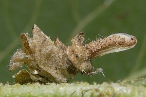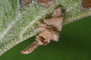Auffällig ist der schmale Kamm an der Schleifseite des Raupensackes (siehe Raupenbild 3). Dieses Merkmal tritt aber auch bei einigen anderen Coleophora-Arten auf. [Rudolf Bryner]