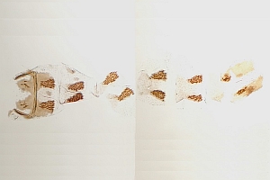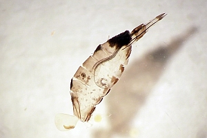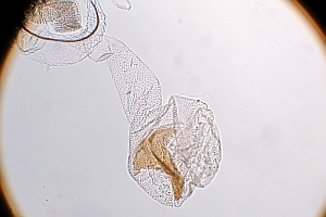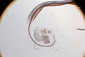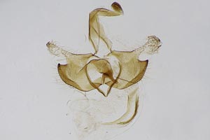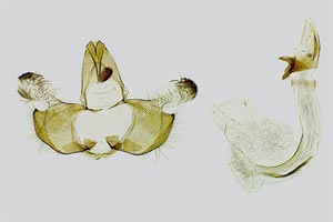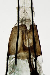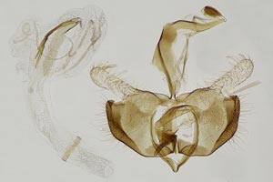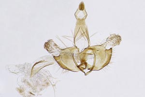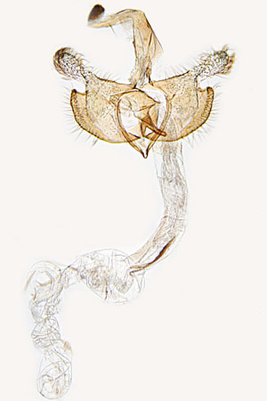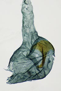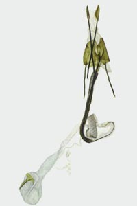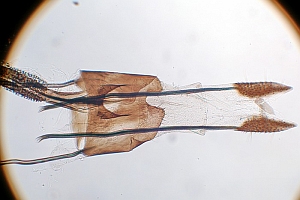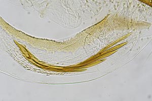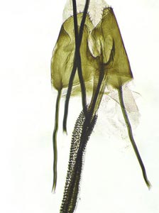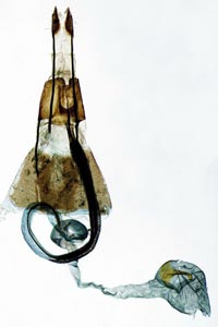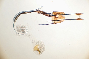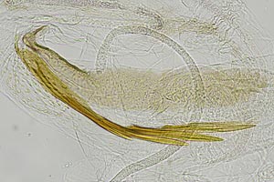 Bild 2 zeigt die Cornuti in starker Vergrößerung. Diese sind zur Abgrenzung gegenüber Coleophora frischella besonders geeignet: Bei Coleophora frischella sind die Cornuti zahlreich (10 und mehr), sie werden gegen die Basis des Cornuti-Büschels immer kleiner. Bei Coleophora alcyonipennella sind nur ca. 3-5 Cornuti vorhanden, sie sind alle etwa gleich groß. Unterschiede gibt es auch im Bau des Aedoeagus, insbesondere beim Phallus-Apodem: Bei Coleophora alcyonipennella weist es unmittelbar vor dem Endring drei enge Windungen auf [1], bei Coleophora frischella sind es vier. Dieser Bereich wird allerdings bei herkömmlicher Einbettung (Entwässerung + Einschluss in Euparal) weitgehend unsichtbar. Hier wurde das Präparat in der Präparationsflüssigkeit (80 % Wasser, 20 % Isopropanol) vor der Entwässerung unter einem Deckglas fotografiert. (Text: Peter Buchner, Merkmalsgegenüberstellung nach einer telefonischen Auskunft von Andreas Stübner)