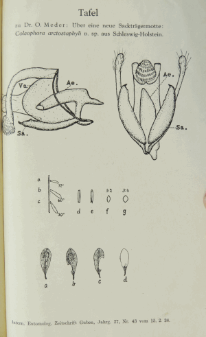 - Heckford, R. J. & S. D. Beavan (2018): Coleophora arctostaphyli Meder, 1934 (Lepidoptera: Coleophoridae): observations on the early stages. — Entomologist's Gazette 69 (2): 115-118.