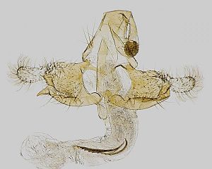 1: Genitalpräparat eines nicht abgebildeten ♀, Österreich, Niederösterreich, Mödling, tiefgründige pannonische Halbtrockenrasen, am Licht 20. Juli 2006, (leg., det., Präparation und Mikro-Foto: Peter Buchner) (das große Bild der Genitalarmatur wird evtl. nicht in höchster Auflösung angezeigt. In diesem Fall auf das Symbol "Vergrößern" klicken)