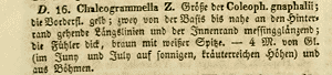 Baldizzone (1995: 45): “In conseguenza dello studio del materiale originale della collezione Zeller, conservato al British Museum (Natural History), ho la possibilità di fissare il lectotypus [prima designazione] di C. chalcogrammella Zeller: exemplare ♂ in buone condizioni, reca le seguenti etichette: