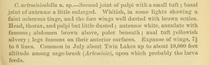 Chambers (1877: 133) vermutet Artemisia als Nahrung der Raupe: “Common in July about Twin Lakes up to about 10,000 feet altitude among sage-brush (Artemisia), upon which probably the larva feeds.”