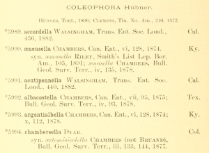 - Beschreibung als Coleophora artemisicolella: Chambers, V. T. (1877): The Tineina of Colorado. — Bulletin of the United States Geological and Geographical Survey of the Territories 3 (1): 121-142.