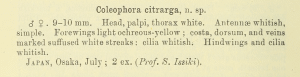 - Baldizzone, G. & T. Oku (1989): Descriptions of Japanese Coleophoridae III. — Tyô to Ga 41 (2): 97-112. [PDF auf ia904500.us.archive.org]