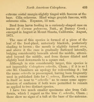 - Erstbeschreibung: Walsingham (1882): North American Coleophorae. — The Transactions of the Entomological Society of London for the Year 1882 (3): 429-442, pl. XVII.