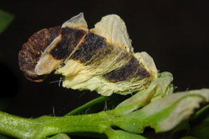 Die Raupe findet sich zumeist am Gewöhnlichen Hornklee, was schon Stainton (1859: 179) detailliert beschrieb. Schütze (1931) berichtete später: "Raupe seit August an Lotus corniculatus, Lotus pedunculatus [häufiger weiterer Name: Lotus uliginosus] und Medicago, überwintert halberwachsen und frisst im Frühjahr weiter (Sorhagen). Sack scheidenförmig, besonders gegen das Ende hin stark komprimiert, mit scharfer Rücken- und Bauchkante, von zwei Dritteln ab stark abwärts gekrümmt, dunkelbraun, in der vorderen Hälfte mit schrägliegenden lichtbraunen oder grünlichen Anhängseln (Heinemann)."