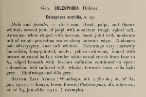 • Coleophora ptilocharis Meyrick, 1938 [synonymisiert von Baldizzone, van der Wolf & Landry (2006: 12)]