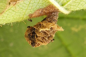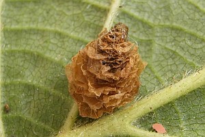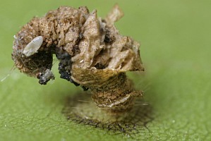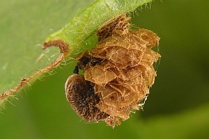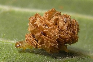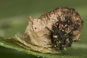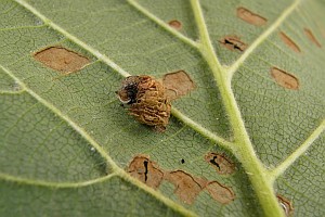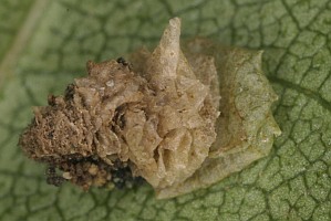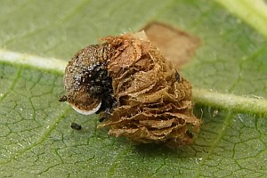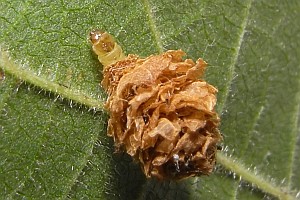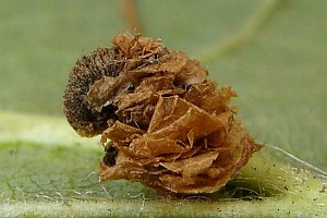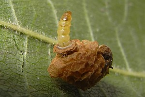Schon Herrich-Schäffer ([1855]: 230-231) fand die Raupensäcke für seine Erstbeschreibung in Bayern an Haseln. Schütze (1931) führt die Raupe ebenfalls unter Corylus avellana an und schreibt dazu: "An der Unterseite der Blätter, miniert kleine runde Flecke, so dass das Blatt oben ganz getupft erscheint; überwintert erwachsen. Lappensack hinten stark abwärts gekrümmt, sonst überall mit ringförmigen Anhängseln, braun (Sorhagen). Ich fand ihn einzeln auch an Betula. Minierte Blätter sieht man nur an den unteren Zweigen. Die Säcke, am Grunde der Haselstämmchen angesponnen, sind im Winter leicht zu finden und liefern im geheizten Zimmer ohne Schwierigkeit den Falter (Schütze)." Haseln sind die übliche und sicher weitaus wichtigste Raupennahrungspflanze der Art.