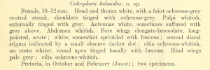 - Erstbeschreibung: Meyrick, E. (1911): Descriptions of Transvaal Micro-Lepidoptera. II. — Annals of the Transvaal Museum 2 (4): 218-240.