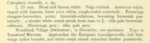 Meyrick (1911: 78) vergleicht seine neue Art mit der europäischen Coleophora limosipennella: "Approaches the European Limosipennella, but forewings rather broader, and white costal streak extended further posteriorly." Über die Verwandtschaft der beiden Arten sagt das noch wenig aus.