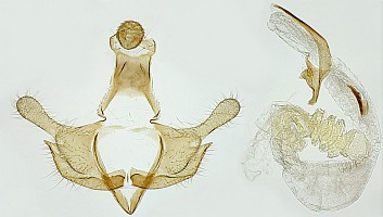 Ein wichtiger Unterschied in den weiblichen Genitalien von Coleophora mareki gegenüber C. serpylletorum und C. chamaedriella liegt in der Form des Vorderrandes des Sterigmas: Gerade bei Coleophora mareki, konkav bei den beiden anderen Arten. Dieser Bereich im Einschub in Bild 1 rot markiert (Text: Peter Buchner, nach der in der Originalbeschreibung angegebenen Merkmalsgegenüberstellung).