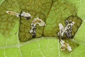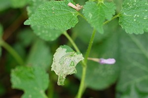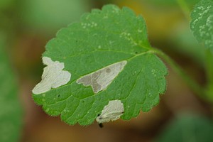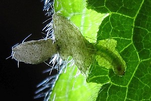 Die Raupen leben an verschiedenen Lippenblütengewächsen (Lamiaceae), vor allem verschiedenen Taubnesseln (Lamium spp.), Schwarznessel (Ballota nigra) und Wald-Ziest (Stachys sylvatica). Schon in der Erstbeschreibung von Zeller (1849) ist für die Umgebung von Jena (Thüringen) zu lesen: "Die Raupe lebt ab Ballota nigra, Lamium album und purpureum, am liebsten an buschigen, schattigen Stellen. Sie frisst nur das Diachym der Blätter aus und die hellen, dadurch entstandenen Flecke auf denselben lassen ihre Gegenwart leicht erkennen.". Die bei Schütze zu findende Angabe zu Glechoma hederacea erscheint möglich, sollte aber überprüft werden; gleiches gilt für die Angabe "Teucrium" bei Baldizzone (2019: 57).