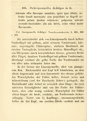 Baldizzone (1994: 11) designierte einen Lectotypus: “Lectotypus ♂ [designato in questa sede] conservato al BMNH, reca le seguenti etichette: 1) “LECTOTYPE” (a stampa, rotondo, orlato di blu), 2) “Ochripennella Schlg. Linaea 4, 408” (a mano), 3) “Zeller Coll. Walsingham Collection. B.M 1910-427” (a stampa), 4) “B.M. ♂ Genitalia slide No. 2749” (a stampa e mano).”
